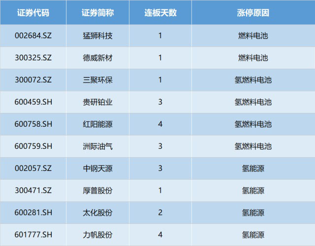 氫燃料電池板塊延續(xù)強(qiáng)勢(shì),再次雄霸漲停榜,成為漲停榜上占比最多的板塊。紅陽(yáng)能源、力帆股份霸氣四連板,其他個(gè)股猛獅科技(002684.SZ)、德威新材(300325.SZ)、三聚環(huán)保(300072.SZ)、貴研鉑業(yè)、洲際油氣、中鋼天源、厚普股份(300471.SZ)、太化股份(600281.SH)紛紛漲停。