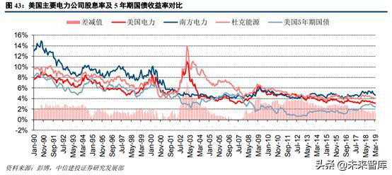 從美國主要電力公司股息率趨勢來看,其股息率整體震蕩下行,與美國5年期國債收益率趨勢較為一致。近年來三家公司股息率均值減去國債收益率的差減值相對穩(wěn)定,我們判斷相關(guān)公司估值中樞上移有較大因素是受無風(fēng)險利率下行推動所致。