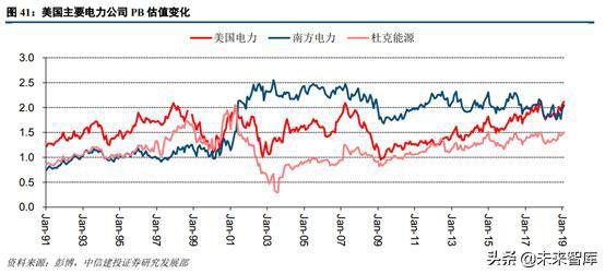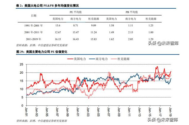 從美國電力等三家公司近三十年的PE估值水平來看,其估值波動區(qū)間主要在10-20倍之間且呈現(xiàn)震蕩上行趨勢。我們將時間劃分為1991年-2001年、2001年-2011年及2011-2019年三個區(qū)間,美國電力、南方電力和杜克能源的平均PE分別為13.6/8.71/9.09、12.67/15.47/11.24、16.15/16.43/15.83,市盈率估值穩(wěn)步提升的趨勢較為明顯。
