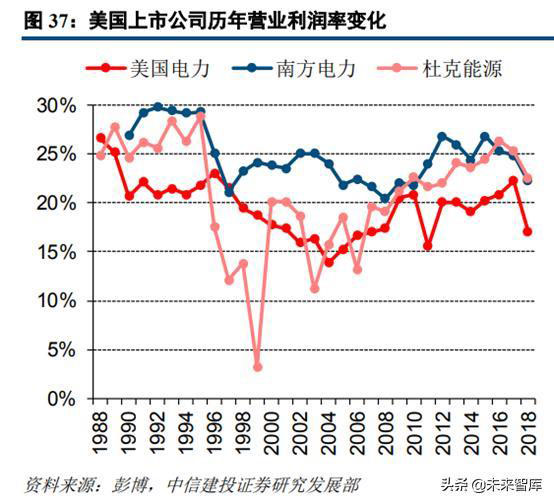 從中美上市火電公司的營業(yè)利潤率對比也可以看出,美國上市電力公司近年來營業(yè)利潤率穩(wěn)定在20%—25%之間,歷史波動幅度也窄于中國上市電力公司。這也進(jìn)一步佐證了美國火電公司盈利穩(wěn)定性高于中國火電公司的判斷。