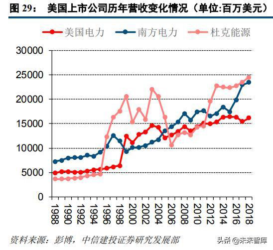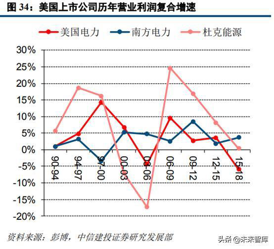 由于中美電力工業(yè)發(fā)展進(jìn)程及體制改革進(jìn)度的不同,中美電力公司在具體經(jīng)營方式方面有一定的差異化。在廠網(wǎng)分離的改革政策推動下,中國電力公司主營業(yè)務(wù)均以發(fā)電業(yè)務(wù)為主,煤炭生產(chǎn)、供熱等業(yè)務(wù)占比極小,幾乎沒有配售電業(yè)務(wù)。而美國電力公司大部分均在公用事業(yè)領(lǐng)域里有廣泛涉獵,在電力業(yè)務(wù)方面從事發(fā)輸配售一體化經(jīng)營,此外還參與天然氣、石油、綜合能源運營等業(yè)務(wù)。在美國電力上市公司中,單獨從事發(fā)電業(yè)務(wù)的獨立發(fā)電公司(IPP)較少且不具代表性。考慮到美國電力市場經(jīng)過多年發(fā)展后已較為成熟完備,電力公司的電力業(yè)務(wù)及其他業(yè)務(wù)盈利較為穩(wěn)定,均表現(xiàn)出公用事業(yè)屬性,我們選取美國電力、南方電力及杜克能源等三家市值較大的企業(yè)進(jìn)行分析,以期與中國的華能國際、華電國際做對比,并對中國火電行業(yè)未來熨平周期波動后的估值可能性進(jìn)行分析。