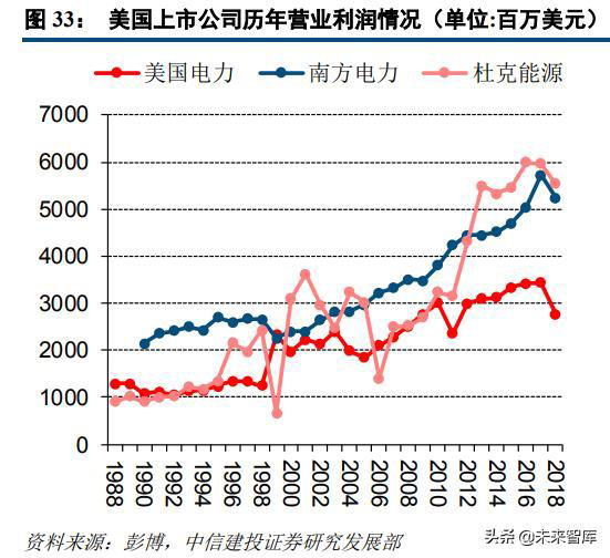 從美國上市公司的盈利情況來看,雖然年際間營業(yè)利潤情況有所波動,但整體仍保持穩(wěn)健提升的趨勢。自2011年之后,相關(guān)企業(yè)營業(yè)利潤及增速保持相對平穩(wěn),波動幅度較之前的年份有所收窄。在前面我們對于美國電力市場化進(jìn)程及機(jī)制的分析中也可以看到,以PJM為代表的一系列區(qū)域輸電組織已形成了相對完備的電力市場化交易機(jī)制,通過長期合約、期貨、現(xiàn)貨等一系列交易手段,電力的商品屬性及真實價格得到充分體現(xiàn)。發(fā)電企業(yè)可以依據(jù)電力供需格局及能源價格,合理調(diào)整發(fā)電側(cè)報價,在一定程度上可以轉(zhuǎn)移燃料成本波動對于自身盈利能力的沖擊影響。