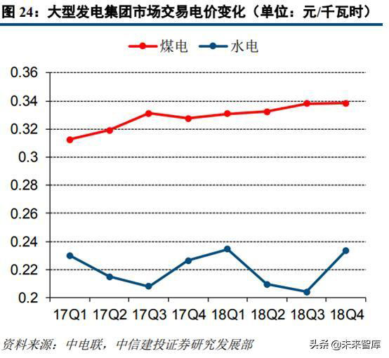 從大型發(fā)電集團(tuán)的市場化交易電價變化趨勢來看,煤電及水電的交易電價整體趨勢向上。大型發(fā)電集團(tuán)2018年煤電市場交易(含跨區(qū)跨省市場交易)平均電價為0.3383元/千瓦時,較上年提高0.0119元/千瓦時;水電機(jī)組市場交易平均電價為0.2245元/千瓦時,較上年提高0.0038元/千瓦時。