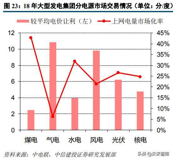 2018年大型發(fā)電集團(tuán)上網(wǎng)電量合計36587億千瓦時,同比增長11%;其市場交易電量合計13713億千瓦時(不含發(fā)電權(quán)交易),同比增長26.4%,占大型發(fā)電集團(tuán)合計上網(wǎng)電量的37.5%,較上年提高4.5個百分點。從分電源情況來看,煤電機(jī)組上網(wǎng)電量市場化率最高,達(dá)42.8%,市場電較平均電價讓利為2.45分/千瓦時;水電上網(wǎng)電量市場化率排名第二,達(dá)31.9%,市場電較平均電價讓利為3.96分/千瓦時。風(fēng)電、氣電等電源市場化率相對較低,對應(yīng)度電讓利較高。