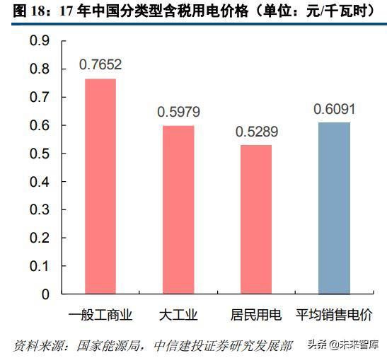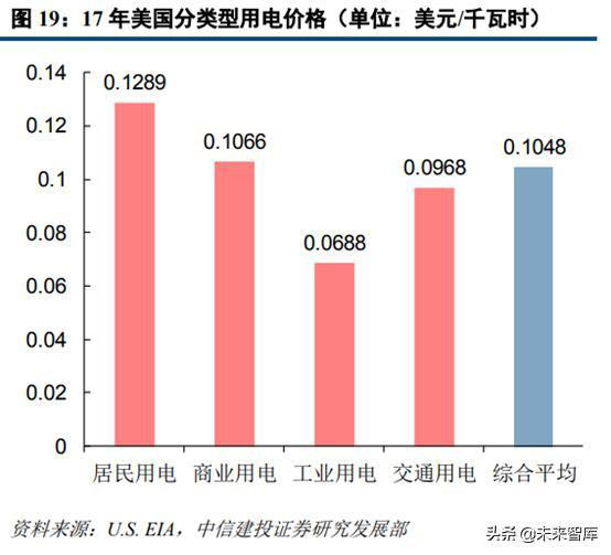 從2017年分類型用電價格的數(shù)據(jù)來看,中美電價水平整體較為接近,但美國居民用電價格大幅高于中國。我國一般工商業(yè)的平均用電電價較高,為0.76524元/千瓦時,大工業(yè)和居民用電的平均電價分別為0.59785元/千瓦時和0.52894元/千瓦時。而美國平均用電價格最高的用戶類型為居民用電,為0.1289美元/千瓦時,商業(yè)用電、交通用電和工業(yè)的平均電價則相對較低,分別為0.1066、0.0968和0.0688美元/千瓦時(數(shù)據(jù)來自于EIA,各地州政府或有少量稅費)。