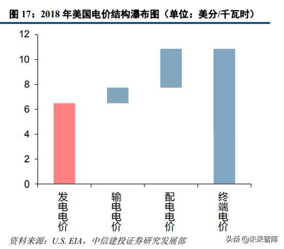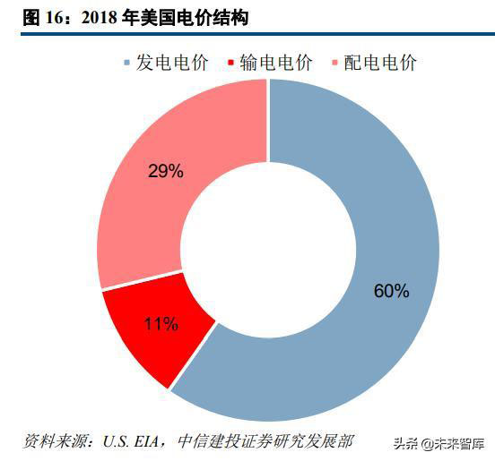 而美國的銷售電價主要由發(fā)電電價、輸電電價以及配電電價構(gòu)成。2018年美國終端用電價格為10.85美分/千瓦時,其由上網(wǎng)電價(6.49美分/千瓦時)、輸電電價(1.24美分/千瓦時)和配電電價(3.12美分/千瓦時)構(gòu)成,三者占比分別為60%、11%和29%。