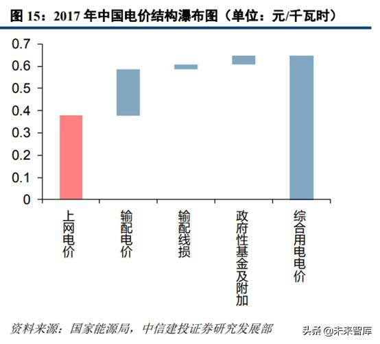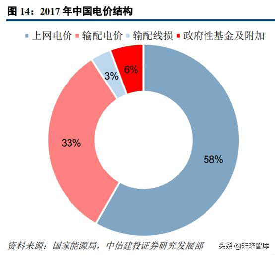 我國銷售電價構(gòu)成主要包括上網(wǎng)電價、輸配電價、輸配線損和政府性基金及附加。根據(jù)發(fā)改委2017年電力價格監(jiān)管相關(guān)通告數(shù)據(jù),電網(wǎng)企業(yè)平均含稅銷售電價為0.6091元/千瓦時(不含政府性基金及附加)。對于下游用戶綜合用電電價而言,其由發(fā)電企業(yè)上網(wǎng)電價(0.3763元/千瓦時)、輸配電價(0.2107元/千瓦時)、輸配電線損(0.02213元/千瓦時)和政府性基金及附加(0.0366元/千瓦時),合計為0.6457元/千瓦時。從占比來看,上網(wǎng)電價、輸配電價、輸配線損和政府性基金及附加占比分別為58%、33%、3%和6%。