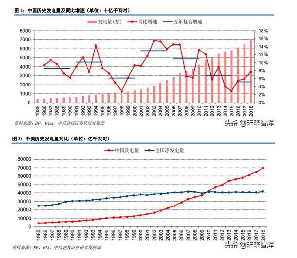 1、對比美國歷史七十年發(fā)電量數(shù)據(jù)和中國歷史35年發(fā)電量數(shù)據(jù)可以看出,近年來美國發(fā)電量基本無增長,電力工業(yè)處于成熟期;中國發(fā)電增速面臨換擋,或?qū)@5%這一中樞波動,有可能正式進(jìn)入穩(wěn)定成長期,對標(biāo)美國70年代到90年代的情況;