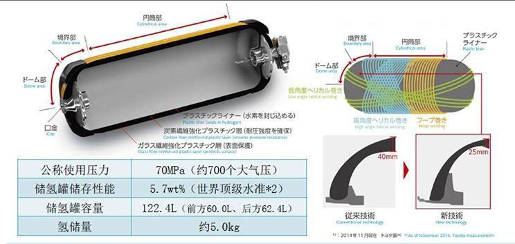 氫燃料電池車型最近幾年得到了一定的發(fā)展,它使用氫氣作為燃料,利用氫氧之間的化學(xué)反應(yīng)來發(fā)電,而它的排放物是“水”。氫燃料的加注時(shí)間要比純電動(dòng)車的時(shí)間短很多,所以有不少人更看好氫燃料電池車型的發(fā)展,不過該車型目前還有諸多技術(shù)限制,比如車內(nèi)無法存儲(chǔ)足夠數(shù)量的氫。以豐田Mirai(參數(shù)|詢價(jià))燃料電池車為例,目前采用的是儲(chǔ)氫罐容量為122.4L,約5kg的氫儲(chǔ)量,EPA續(xù)航里程為312英里(約502公里)。
