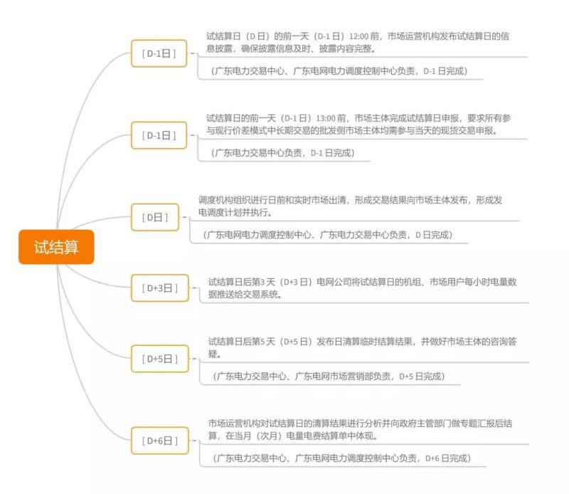 試結(jié)算日(D 日)的前一天(D-1 日)12:00 前,市場(chǎng)運(yùn)營(yíng)機(jī)構(gòu)發(fā)布試結(jié)算日的信息披露,確保披露信息及時(shí)、披露內(nèi)容完整。(廣東電力交易中心、廣東電網(wǎng)電力調(diào)度控制中心負(fù)責(zé),D-1 日完成)
