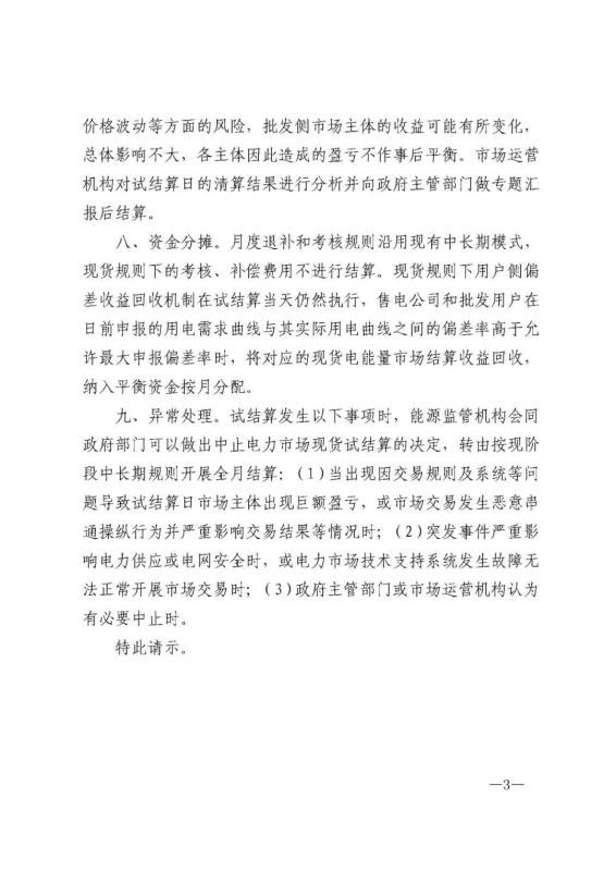 出清的方式是:按照日前和實(shí)時(shí)出清結(jié)果,形成試結(jié)算日的發(fā)電調(diào)度計(jì)劃并執(zhí)行?!墩?qǐng)示》提到在交易結(jié)算方面。將試結(jié)算日的出清結(jié)果按現(xiàn)貨順價(jià)模式結(jié)算,當(dāng)月其余天仍按照現(xiàn)有價(jià)差模式結(jié)算。