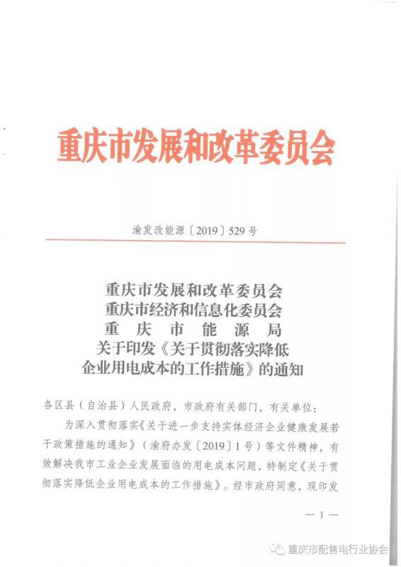 2019年4月28日,重慶市發(fā)改委、經(jīng)信委、能源局聯(lián)合印發(fā)了《關(guān)于貫徹落實(shí)降低企業(yè)用電成本的工作措施》(渝發(fā)改能源 [2019]529號(hào),以下簡(jiǎn)稱工作措施)的通知。該文件是落實(shí)重慶市政府一號(hào)文《關(guān)于進(jìn)一步支持實(shí)體經(jīng)濟(jì)企業(yè)健康發(fā)展若干政策措施》(渝府辦[2019]1號(hào))的配套舉措。根據(jù)渝府辦[2019]1號(hào)的要求,從發(fā)電、輸配、政府基金及附加、用戶四端共同發(fā)力,將產(chǎn)品有市場(chǎng)的重點(diǎn)工業(yè)企業(yè)用電價(jià)格降低到0.6元/千瓦時(shí)左右?!豆ぷ鞔胧吩诖吮尘跋鲁雠_(tái),強(qiáng)調(diào)了通過(guò)市場(chǎng)機(jī)制降低工商企業(yè)用電成本。注意到,文中強(qiáng)調(diào)的“成本”包含但并不局限于用電“價(jià)格”,而是從資產(chǎn)管理、優(yōu)化運(yùn)營(yíng)、用戶服務(wù)等多維度為企業(yè)減負(fù),提升企業(yè)獲得感。