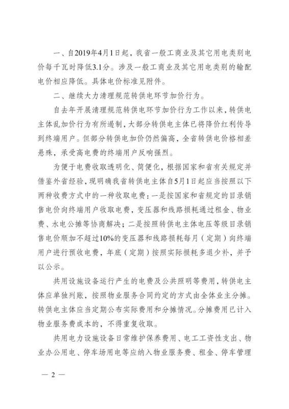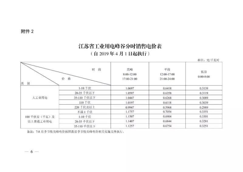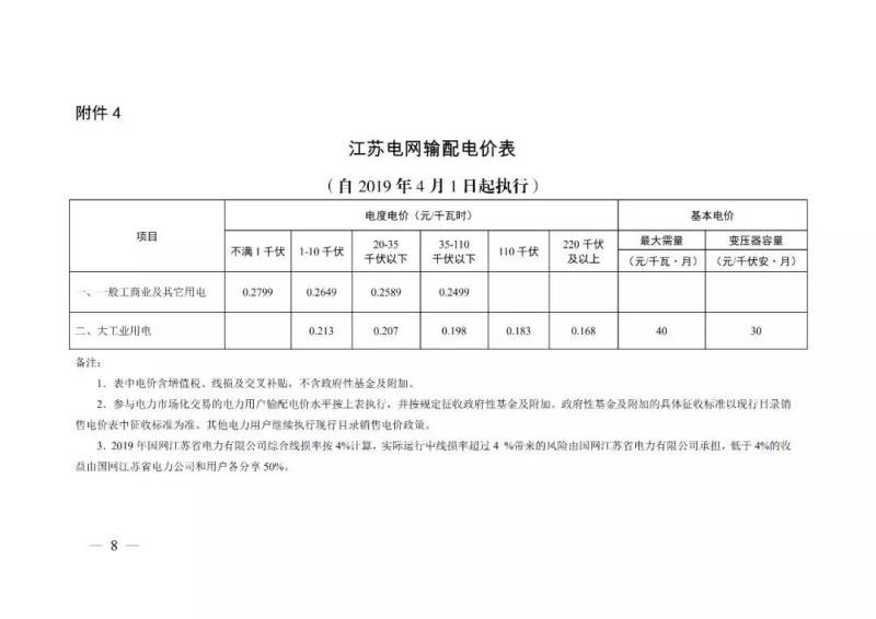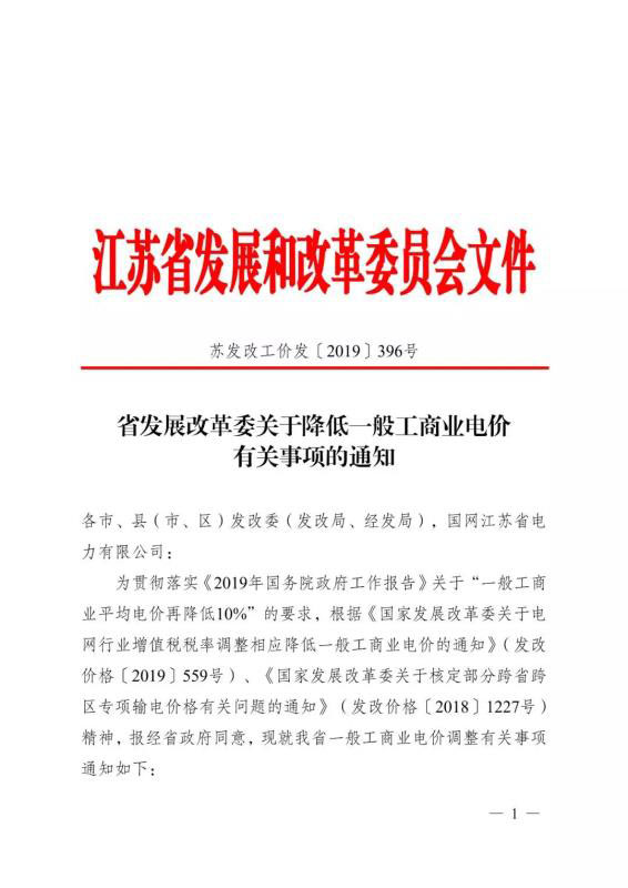 4月29日,江蘇發(fā)改委正式印發(fā)《省發(fā)展改革委關(guān)于降低一般工商業(yè)電價(jià)有關(guān)事項(xiàng)的通知》。自2019年4月1日起,江蘇省一般工商業(yè)及其它用電類別電價(jià)每千瓦時(shí)降低3.1分。涉及一般工商業(yè)及其它用電類別的輸配電價(jià)相應(yīng)降低。