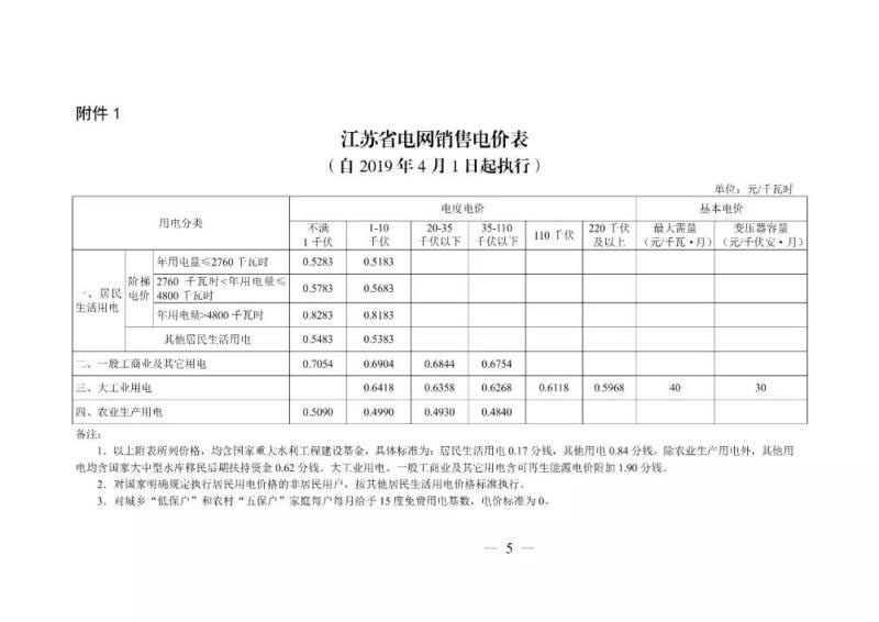 2019年4月1日起執(zhí)行的江蘇電網(wǎng)輸配電價(jià)表。