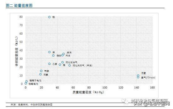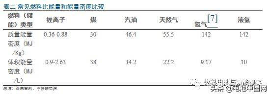 同其他燃料相比,氫的最大優(yōu)勢(shì)是超高的質(zhì)量能量密度和可接受的體積能量密度(需壓縮氫氣或液化),常見燃料能量密度如表二所示: