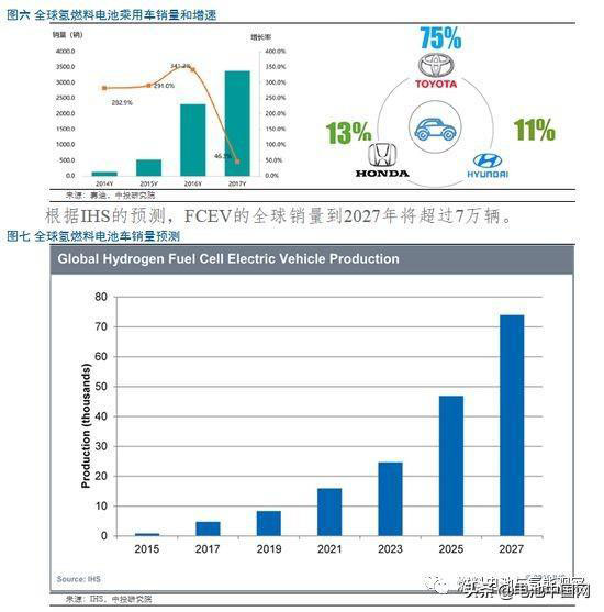 全球來(lái)看,燃料電池車乘用車的年銷量還處在千輛數(shù)量級(jí)上,與燃油車接近1億輛和電動(dòng)車(純電加混動(dòng))200萬(wàn)輛的數(shù)字相去甚遠(yuǎn)。但2014年豐田Mirai面世,帶來(lái)燃料電池汽車銷量增速的提升,市場(chǎng)開始升溫。2013年到2017年底,全球總計(jì)售出6475輛氫燃料電池乘用車,其中豐田Mirai占比高達(dá)75%。