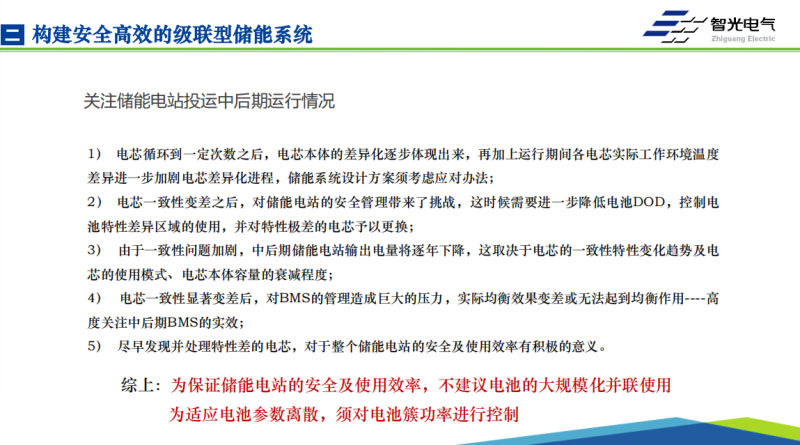 另外,我們所有的單體,大家一致性做的再好,但是還是會(huì)有差異,在運(yùn)行的過(guò)程中總是會(huì)離散,特也是在它的首端和末端,性能會(huì)離散的。為了保持我們的一致性,所以我們?yōu)槭裁匆タ刂艱OD,在這個(gè)方面也是有其中的一些因素在里。當(dāng)我們并聯(lián)的電池越多的時(shí)候,我們這個(gè)DOD的范圍是不是要縮小,我們運(yùn)行在初期的時(shí)候,比如我們DOD是90%,當(dāng)然這個(gè)90%我這里要說(shuō)明一下,在最近我們一些標(biāo)準(zhǔn)里頭,大家指定的對(duì)SOC的定義,它的分母變量是一個(gè)變化的,當(dāng)然我的分析是在于我們能不能用一個(gè)分母不變的數(shù)據(jù)來(lái)對(duì)電池的可用容量、對(duì)電池使用的容量來(lái)進(jìn)行定義,如果說(shuō)在這種定義的情況下,就意味著當(dāng)我們電池使用連線增加了以后,我們是要去縮短,我們可能要去控制可用容量的,就是說(shuō)我們是不是要去把我們BMS電壓范圍,特別是并聯(lián)到一起以后,當(dāng)我們掌握不了每一個(gè)電芯實(shí)際的情況的時(shí)候,在運(yùn)行的中后期,比如運(yùn)行2年、3年以后,我們要不要把保護(hù)的電壓范圍縮窄,為了安全我們要不要去縮窄,這個(gè)是我們要去考慮的。再有一個(gè),當(dāng)我們把大量的電芯并聯(lián)到一起以后,它可能會(huì)帶來(lái)一些功率分配上的問(wèn)題、電流分配上的問(wèn)題,它可能會(huì)不均衡。這些就會(huì)導(dǎo)致我們整個(gè)電池的不可控性會(huì)增加。所以我們就主張要做小容量的電池包來(lái)解決這個(gè)問(wèn)題。