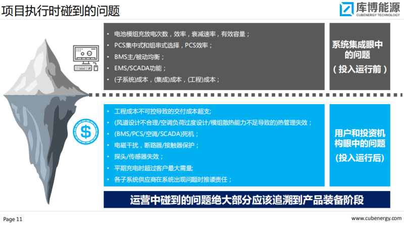 電池模組充放電次數(shù)、效率、衰減速率、有效容量、PCS集中式和組串式選擇,BMS主被動均衡,EMS、CSADA功能,最后是成本!成本!成本!所以我們開始的時候投入運行前考慮的問題,事實上是技術(shù)的問題,投入運行后會發(fā)現(xiàn)哪些問題呢,開個玩笑說都是雞毛蒜皮的事情,可能一個傳感器1.8毛錢,影響2天、3天的時間,造成的收益損失高達1萬、2萬,這些問題都不是我們前面看到的,都是運行的時候看到的,電池干擾、短路器、接觸器保護、探頭、傳感器失效,平期充電時超過客戶最大需量,各子系統(tǒng)供應(yīng)商在系統(tǒng)出現(xiàn)問題時推諉責(zé)任,集成的過程中投入運行后我們會發(fā)現(xiàn)有各式各樣的問題。我們目前總結(jié)和定義來說,運營中碰到的問題絕大部分應(yīng)該追溯到產(chǎn)品裝備的階段。