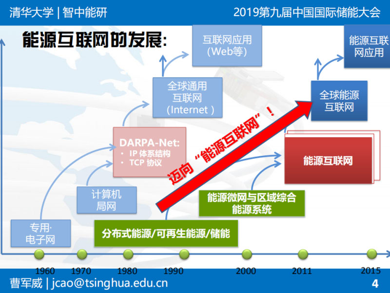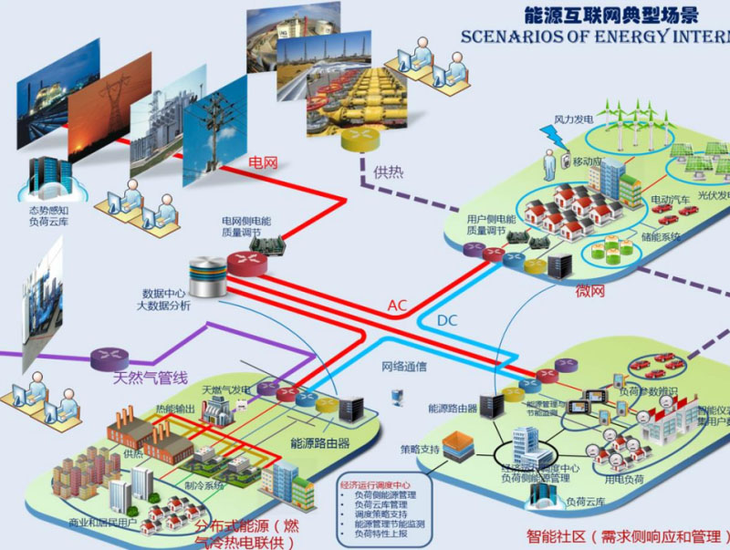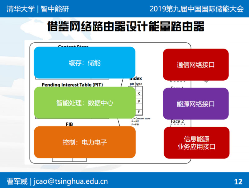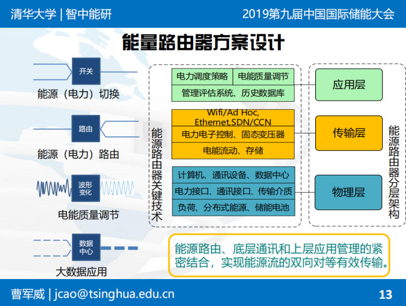 曹軍威:非常高興有機(jī)會(huì)在這里和大家分享。能源路由器的概念是從能源互聯(lián)網(wǎng)的概念延伸出來的。我們前幾年做了類似的裝置和示范工程,跟大家簡單匯報(bào)一下。背景不再多說了,上午專家已經(jīng)說了。能源互聯(lián)網(wǎng)希望像互聯(lián)網(wǎng)一樣自下而上:下有綜合性的園區(qū),上有國家電網(wǎng)的全球能源互聯(lián)網(wǎng),自下而上構(gòu)建能源基礎(chǔ)設(shè)施。從互聯(lián)網(wǎng)的概念類比過來,是不是有可能有類似這種局部的能量層面上的交換和路由裝置。這就是路由器和互聯(lián)網(wǎng)的基本提法?,F(xiàn)在已經(jīng)成為趨勢,之前做學(xué)術(shù)研究的時(shí)候,2011年能源互聯(lián)網(wǎng)可能只是一個(gè)概念,現(xiàn)在大家把能源互聯(lián)網(wǎng)具體形式如綜合能源服務(wù)作為一個(gè)主流趨勢,包括儲(chǔ)能這樣一些具體的環(huán)節(jié),也在大發(fā)展過程中。不詳細(xì)講了。