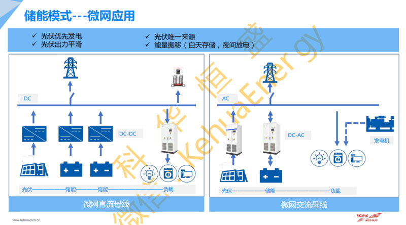 這是我們在離網(wǎng)這一塊的內(nèi)容。另外談到微網(wǎng)應(yīng)用,其實在微網(wǎng)應(yīng)用有兩種模式,一種是DC方案,一種是AC方案。各有優(yōu)勢和劣勢。比如說交流方案,從直流方案來看,它的好處是直流相比來說接入點不一樣。它接入的直流是有一個電壓,正負(fù)極的區(qū)別。但是交流不一樣。從整個的結(jié)構(gòu)來看,直流又存在另外一個問題。因為直流的保護(hù),本身技術(shù)沒有零點,保護(hù)措施是有差異的。第二個問題在于大、微電網(wǎng)。微電網(wǎng)和大電網(wǎng)的區(qū)別就是小跟大的區(qū)別。小的情況下,可以看一下這邊做的微電網(wǎng),核心點全部是電力電子器件,沒有所謂的發(fā)電機。這種情況下我們都知道,電力電子產(chǎn)品的特性完全不一樣。做電力穩(wěn)定的時候,考慮的不光是靠EMS可以搞定的,是靠器件的本身。直流有一個好處,其實像電池是不需要轉(zhuǎn)換的。這個時候你的尺寸就會做得很大。但是還有缺陷。缺陷在于我們直流這一塊的保護(hù)傳輸。相比交流的傳輸是有一定瓶頸的。