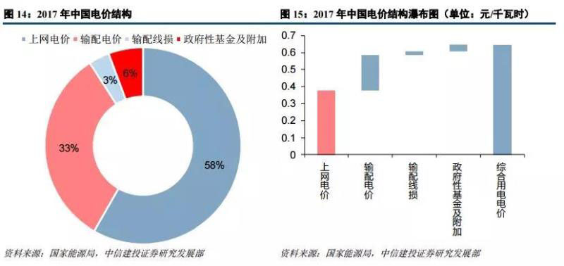 根據(jù)發(fā)改委 2017 年電力 價(jià)格監(jiān)管相關(guān)通告數(shù)據(jù),電網(wǎng)企業(yè)平均含稅銷售電價(jià)為 0.6091 元/千瓦時(shí)(不含政府性基金及附加)。對(duì)于下游 用戶綜合用電電價(jià)而言,其由發(fā)電企業(yè)上網(wǎng)電價(jià)(0.3763 元/千瓦時(shí))、輸配電價(jià)(0.2107 元/千瓦時(shí))、輸配電線 損(0.02213 元/千瓦時(shí))和政府性基金及附加(0.0366 元/千瓦時(shí)),合計(jì)為 0.6457 元/千瓦時(shí)。從占比來看,上 網(wǎng)電價(jià)、輸配電價(jià)、輸配線損和政府性基金及附加占比分別為 58%、33%、3%和 6%。