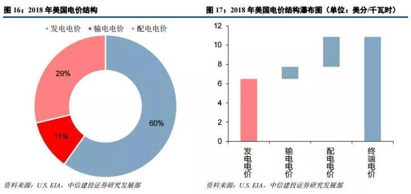 而美國(guó)的銷售電價(jià)主要由發(fā)電電價(jià)、輸電電價(jià)以及配電電價(jià)構(gòu)成。2018 年美國(guó)終端用電價(jià)格為 10.85 美分/ 千瓦時(shí),其由上網(wǎng)電價(jià)(6.49 美分/千瓦時(shí))、輸電電價(jià)(1.24 美分/千瓦時(shí))和配電電價(jià)(3.12 美分/千瓦時(shí))構(gòu) 成,三者占比分別為 60%、11%和 29%。