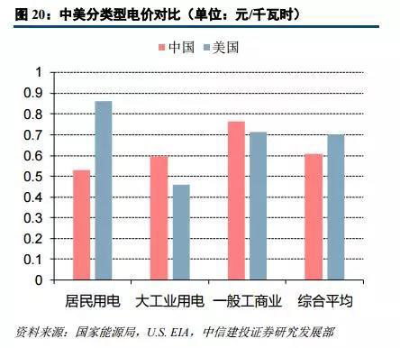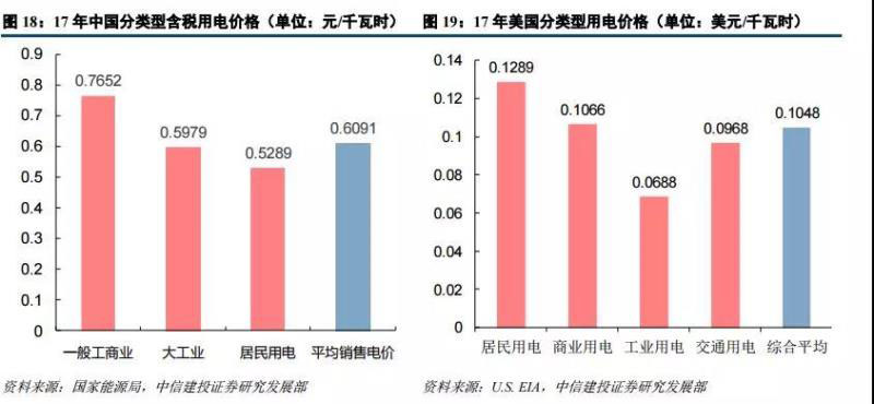 從 2017 年分類型用電價(jià)格的數(shù)據(jù)來看,中美電價(jià)水平整體較為接近,但美國(guó)居民用電價(jià)格大幅高于中國(guó)。我國(guó)一般工商業(yè)的平均用電電價(jià)較高,為 0.76524 元/千瓦時(shí),大工業(yè)和居民用電的平均電價(jià)分別為 0.59785 元/ 千瓦時(shí)和 0.52894 元/千瓦時(shí)。而美國(guó)平均用電價(jià)格最高的用戶類型為居民用電,為 0.1289 美元/千瓦時(shí),商業(yè)用 電、交通用電和工業(yè)的平均電價(jià)則相對(duì)較低,分別為 0.1066、0.0968 和 0.0688 美元/千瓦時(shí)(數(shù)據(jù)來自于 EIA, 各地州政府或有少量稅費(fèi))。