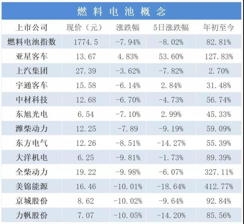 燃料電池方面,從年初至今的變化上看,同氫能概念大致相同,燃料電池指數(shù)和相關(guān)上市公司整體上漲,通過(guò)從最近一個(gè)周的周期上看,除亞星客車(chē)漲跌幅4.83%呈正數(shù)外,其余上市公司漲跌幅均為負(fù)數(shù),而且一半以上漲跌幅接近甚至超過(guò)了-10%,燃料電池指數(shù)在5日內(nèi)的漲跌幅為-8.02%。