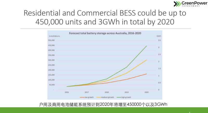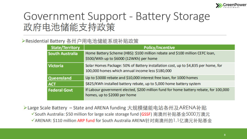 澳大利亞是全球儲(chǔ)能市場(chǎng)增長(zhǎng)最快的國(guó)家之一,前幾名是美國(guó)、澳大利亞、德國(guó)、中國(guó)、日本,可是你要想澳大利亞人口有多少呢?2400萬(wàn),它的增長(zhǎng)速度在2017年比美國(guó)差不了多少,或者相同。這意味著什么呢?澳大利亞在增長(zhǎng)速度上面最快的,至少在2017年這樣,美國(guó)有3個(gè)多億的人口,據(jù)統(tǒng)計(jì),現(xiàn)在大約在澳洲有55個(gè)Agoing(音)的下面加在一起是4個(gè),據(jù)統(tǒng)計(jì)也就是2年,它的這個(gè)總數(shù)會(huì),綠色的就是最好,橘色的就是最低,如果是中國(guó)2020年增加到45萬(wàn)個(gè)。澳大利亞自從《巴黎氣候協(xié)議》在2015年簽署以后,澳洲政府堅(jiān)定不移的承諾和執(zhí)行氣候變化的這個(gè)協(xié)議,政府瞄準(zhǔn)到2030年要實(shí)現(xiàn)50%的可再生能源,這是澳大利亞的各省的主要政策,各省跟聯(lián)邦政府也可能不是一個(gè)黨,聯(lián)邦政府是一個(gè)黨,每個(gè)省還有每個(gè)黨,有兩大黨,也不知道哪個(gè)省是哪個(gè)黨領(lǐng)導(dǎo)的,每個(gè)黨有不同的政策,所以我們這個(gè)橘黃色的是比較獨(dú)特的一個(gè)洲,他現(xiàn)在已經(jīng)沒(méi)有了,現(xiàn)在已經(jīng)實(shí)現(xiàn)了50%可再生能源的應(yīng)用,瞄準(zhǔn)在2050年實(shí)現(xiàn)全部的零排放。澳洲政府對(duì)這個(gè)綠色能源的支持是非常有效的,也是實(shí)質(zhì)性的,在光伏方面把這個(gè)不同的項(xiàng)目分成兩大檔次,100千瓦為界限,大于100千瓦是大項(xiàng)目,小于100千瓦是小項(xiàng)目。補(bǔ)貼方式也不一樣,具體數(shù)字不一一說(shuō)了,時(shí)間關(guān)系。