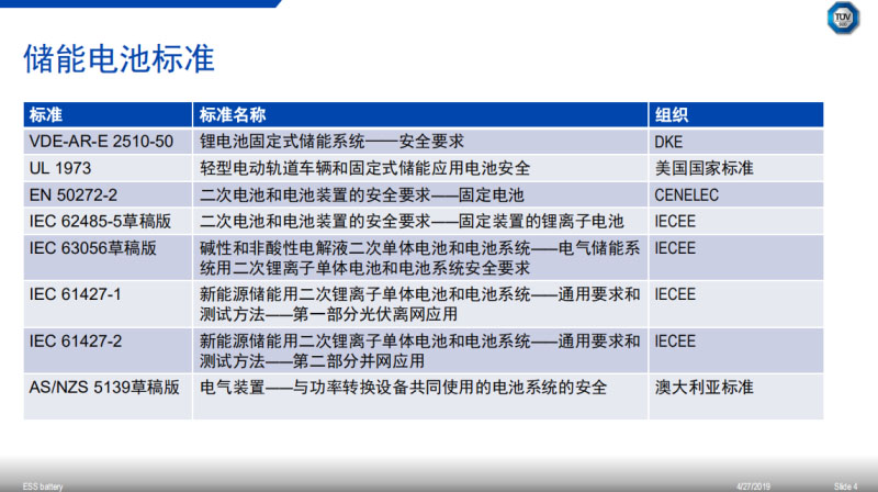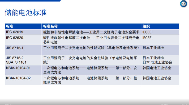 在2018年可以說韓國的儲(chǔ)能電池市場火了,怎么火了?有兩方面的含義,剛剛田女士給大家展示過韓國的儲(chǔ)能電池份額在全球不是很高,但是去年韓國儲(chǔ)能電站有報(bào)道的火災(zāi)就有16起,韓國大概有1000多座儲(chǔ)能電站,那么平均不到100個(gè)電站就發(fā)生一次火災(zāi)。這說明什么問題呢?儲(chǔ)能電池的風(fēng)險(xiǎn)還是非常大。如何降低儲(chǔ)能電池的風(fēng)險(xiǎn)呢?事實(shí)上鋰離子儲(chǔ)能電池發(fā)展的歷史并不長,但是各種國際標(biāo)準(zhǔn)、國家標(biāo)準(zhǔn)和行業(yè)標(biāo)準(zhǔn)還是不少的,例如IEC 62619,JIS 8715-2,UL 1973和VDE 2510-50等。