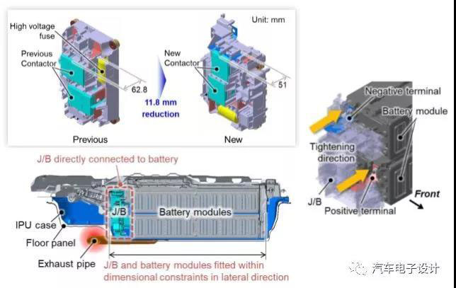 配電盒和電池模組的連接方式,可以通過更有效的電氣連接方式進行連接,如下圖所示,這里的英文原文為direct connection of J/B and battery modules,我們可以理解為直接兩個正負(fù)極柱直接懟上去了。