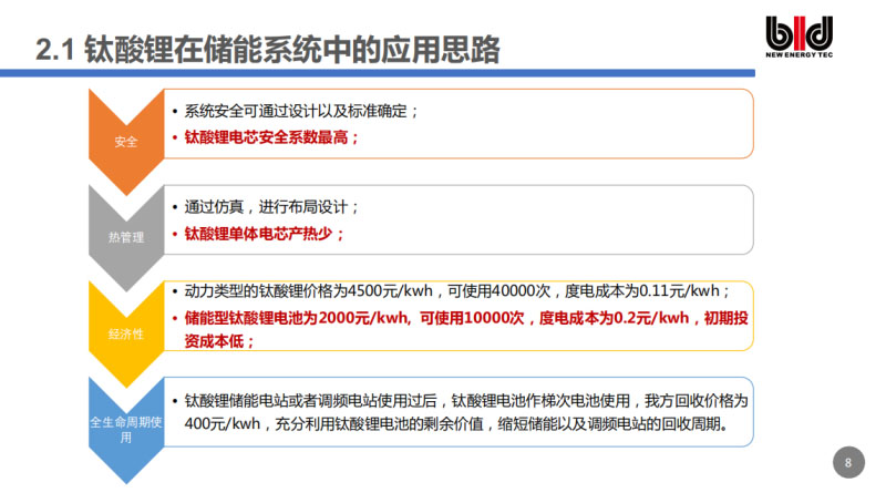 第三個(gè),經(jīng)濟(jì)性。以前我們沒有把動(dòng)力電池和儲(chǔ)能電池嚴(yán)格區(qū)分開來,現(xiàn)在我們按應(yīng)用需求提供不同功能的產(chǎn)品,從而更好的推廣鈦酸鋰電池的應(yīng)用。鈦酸鋰電池應(yīng)用的瓶頸主要是價(jià)格方面,比如動(dòng)力電池鈦酸鋰的要求高,價(jià)格昂貴,現(xiàn)在大概是4500元/度,可以使用4萬次,度電成本是0.11元/千瓦時(shí),但是初期成本太高,除了在一些不得不用它的場(chǎng)合,比如軌道交通場(chǎng)合,人家只敢用鈦酸鋰電池,不敢使用磷酸鐵鋰,其他場(chǎng)合,大家想用也沒法盈利。如果在儲(chǔ)能領(lǐng)域使用動(dòng)力型的鈦酸鋰電池,沒有企業(yè)會(huì)接受,所以我們公司針對(duì)這個(gè)市場(chǎng)推出了我們動(dòng)力儲(chǔ)能型的鈦酸鋰電池?,F(xiàn)在我們的儲(chǔ)能用鈦酸鋰電池可以達(dá)到2千元/度電,可以使用1萬次,是在1C充放的情況下,度電成本是0.2元/瓦時(shí),和動(dòng)力電池比起來,它的初期投資成本會(huì)偏低一些。