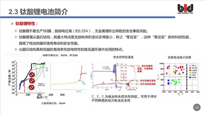 大家都在說鈦酸鋰為什么安全。材料本身來講非常安全。我們負(fù)極采用的是鈦酸鋰,鈦酸鋰的脫嵌電位高約1.55V,不易生產(chǎn)SEI膜,沒有金屬鋰析出導(dǎo)致的安全風(fēng)險(xiǎn)。鈦酸鋰屬于尖晶石結(jié)構(gòu),充放電過程中晶體結(jié)構(gòu)的體積變化非常小。一般來說,因?yàn)槲覀冇蠸EI膜,所以在我電池風(fēng)險(xiǎn)控制鏈條反應(yīng)中,SEI膜和負(fù)極反應(yīng)不存在,引發(fā)的安全風(fēng)險(xiǎn)性就非常小。這個(gè)圖就是通過加速測(cè)試來測(cè)得的,我們發(fā)生各種電池的熱失控觸發(fā)溫度、熱失控的最高溫度,可以看到鈦酸鋰的溫度是非常低的,它也是非常安全的。