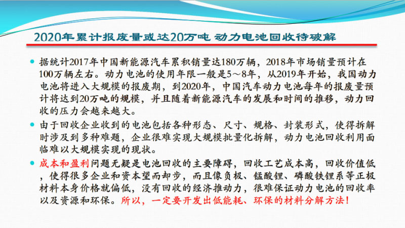 儲能系統(tǒng)要有一些特點,希望大家要注意,我們跟國網(wǎng)一塊做了很多這方面的研究,發(fā)現(xiàn)了一些問題,特別是包括動力電池回收的問題,怎么能夠采用高速分解,分解完了還不污染環(huán)境、減少能耗,我們提出了叫做材料修復,大家注意材料修復,可以重復利用的材料,不是提取里邊的鈷和鎳。