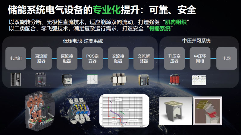 先看一下施耐德所倡導(dǎo)的三重架構(gòu),從底端的互聯(lián)互通的設(shè)備來(lái)實(shí)現(xiàn)現(xiàn)場(chǎng)級(jí)別的快速有效的運(yùn)維,到云端實(shí)現(xiàn)對(duì)整個(gè)系統(tǒng),全生命周期的資產(chǎn)的管理還有優(yōu)化,通過(guò)這種開放,兼容的三層架構(gòu)在儲(chǔ)能系統(tǒng),在新能源系統(tǒng)達(dá)到一個(gè)最優(yōu)的管理平衡。首先第一個(gè)主題就是我們剛剛說(shuō)的如何來(lái)提升全生命周期整個(gè)電力系統(tǒng)的可靠性。把一個(gè)電力系統(tǒng)打開之后可能有低壓配電系統(tǒng)還有中壓配電系統(tǒng),構(gòu)成安全性可靠性的很重要的一點(diǎn)。對(duì)整個(gè)電力系統(tǒng)來(lái)說(shuō)是整個(gè)在儲(chǔ)能系統(tǒng)當(dāng)中受環(huán)境影響性比較大,相對(duì)來(lái)說(shuō)可能造成的損失不多但是造成的頻次是最高的,看一下從低壓配電到高壓配電,其實(shí)里面可以看到,比較核心的就是說(shuō)像里面儲(chǔ)能系統(tǒng)電池輸出的,有的時(shí)候用熔斷器保護(hù),相對(duì)來(lái)說(shuō)具有比較穩(wěn)定可靠性的組合方案將比熔斷器更加可靠性。我們知道儲(chǔ)能系統(tǒng)很大的一個(gè)特點(diǎn)在于儲(chǔ)能的流動(dòng)是雙向的,電池側(cè)進(jìn)行充電也有可能由電池側(cè)向電網(wǎng)側(cè)進(jìn)行放電,在選型設(shè)備的時(shí)候,對(duì)里面尤其是直流側(cè)的在使用當(dāng)中的時(shí)候,它里面的核心關(guān)鍵這里面具有一個(gè)直流的極性,在使用當(dāng)中的時(shí)候,必須要滿足要求,最高達(dá)到1500V在進(jìn)行滅弧分段時(shí)會(huì)達(dá)到正常電壓的2000V的檔次,要求這個(gè)元件必須不具有極性,因?yàn)槠胀ǖ墓夥到y(tǒng)大家知道可以光伏的電能量到電直板如何保證元?dú)夂诵募臎]有極性的安裝使用是在選型當(dāng)中一個(gè)關(guān)鍵,打造這種堅(jiān)強(qiáng)的肌肉系統(tǒng)還有骨骼系統(tǒng)的核心。