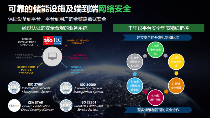 最后說(shuō)安全,安全是一個(gè)永恒的話題,我們一般很多我們認(rèn)為智能化代表著不安全,因?yàn)橹悄芑赡苓^(guò)分的強(qiáng)調(diào)智能化,代表的就是開放性或者可控性會(huì)下降,但是并非如此,這里看到其實(shí)系統(tǒng)安全分為硬件還有軟件兩個(gè)層次,包含數(shù)據(jù)的安全還有應(yīng)用。如果從我們自己打開一個(gè)安全系統(tǒng)來(lái)說(shuō)分兩個(gè)層次,第一個(gè)如何衡量一個(gè)系統(tǒng),或者儲(chǔ)能管理系統(tǒng)是否安全,看它是不是符合標(biāo)準(zhǔn),比如說(shuō)這里面全部的國(guó)際標(biāo)準(zhǔn),看一個(gè)比較重點(diǎn)的ISO27001,它所實(shí)現(xiàn)的關(guān)鍵的管理系統(tǒng),對(duì)系統(tǒng)進(jìn)行認(rèn)證,是一個(gè)體系認(rèn)證,ISO27001將是一個(gè)很關(guān)鍵的因素?,F(xiàn)在成為國(guó)際標(biāo)準(zhǔn),修改過(guò)了若干版,這一系列角度對(duì)信息系統(tǒng)提出安全。從軟件的標(biāo)準(zhǔn)化代碼的安全性到特權(quán)審核,才能保證從內(nèi)部,所以說(shuō)施耐德的安全系統(tǒng),尤其是電力管理的系統(tǒng),內(nèi)部的時(shí)候有非常強(qiáng)的內(nèi)控性,保證用戶在使用當(dāng)中的時(shí)候不會(huì)出現(xiàn)兩大問(wèn)題,一個(gè)問(wèn)題是信息的損失還有信息的丟失。這邊不多說(shuō),因?yàn)閮?chǔ)能系統(tǒng)對(duì)我們來(lái)說(shuō)大家非常專業(yè),可以回顧看到在底層的神經(jīng)元還有肌肉骨骼到云端的全系列管理,可以實(shí)現(xiàn)在儲(chǔ)能挑戰(zhàn)的時(shí)候最優(yōu)化的設(shè)計(jì)。