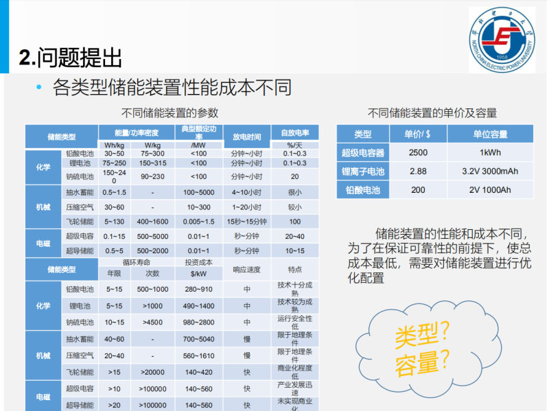這里面我們說的尤其對離網(wǎng)型的離電網(wǎng)最開始建造的這幾個高原地區(qū),海島,邊防,無人區(qū)這些地方,這個微電網(wǎng)的建設(shè)對儲能要求提出了很大的挑戰(zhàn)還有需求。這里面這個儲能里面有很大的作用,起到作用的同時就是相當于什么,這個儲能很多種類型,有功率型的,價錢也不同,這里面來說,所以我們怎么配,配什么類型的,配多大容量,根據(jù)這個資源我們?nèi)ヅ涞臅r候怎么使這個系統(tǒng)的可靠性高,可以滿足負荷的需求,這里面要解決的問題。同時考慮的現(xiàn)在的新元素,電動汽車還有這個管理,同時對負荷這一塊還有一些影響,我們說的這里面是儲能的性能特性。這里面解決的主要措施首先在滿足電、熱這些負荷的情況下,滿足它的功率平衡,還有嫩兩平衡的角度上面,建立一個目標函數(shù),通過智能的算法解決這個具體的問題,風(fēng)的模型光的模型這是很經(jīng)典的模型,我們說的儲能的充放電的模型,這個電動汽車的充放電的模型。