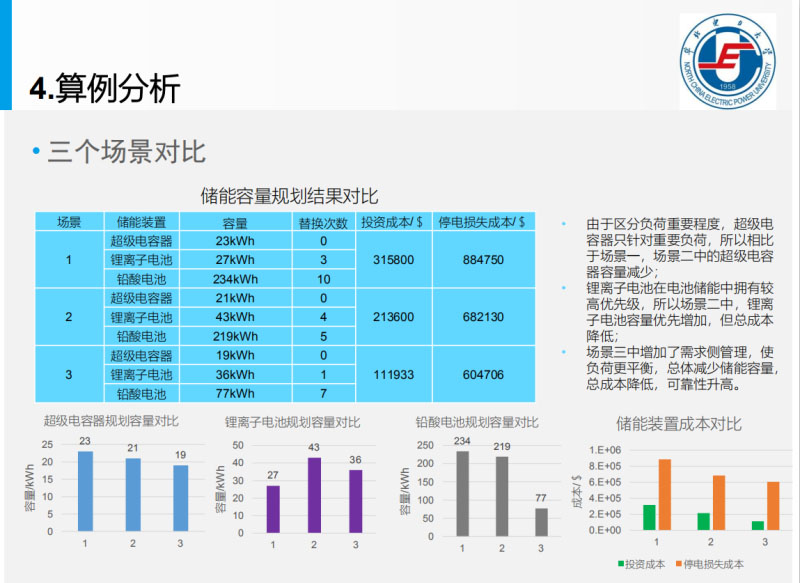 這個一些具體的模型,通過上面這些模型,建立目標函數(shù),從生命周期的角度來講,從一次建設(shè)費用,包括它的運營成本,環(huán)境的補償費用,還有我們說的停電損失費用,這個就是使得綜合的費用是最小的,建立的這個目標函數(shù)。這里面約束條件就是能量的約束,這里面我們說的涉及到一個需求還有策略的問題,我們對于負荷有的負荷就是波動性要求停留時間很短,需要我們說的通過功率型的儲能來頂上去,功率切合的時候需要能量型的儲能頂上去,是重要負荷還是一般負荷根據(jù)這個我們說的負荷的對時間的要求,所以我們是分別采用的超級變速器,超級電容器鋰離子電池這種去配的。優(yōu)化計算以功率差額作為一個表征量,就是去配,根據(jù)時間型的去配,滿足電負荷、還有氣的負荷。這個是人想象的,電動汽車有這個雙重特性,有的時候可以充電,有的時候可以放電,實際的數(shù)據(jù)在里面,我們給一個邊防海島做的這么一個實際的案例,這個負荷我們說的環(huán)境參數(shù),我們自己的參數(shù),這是系統(tǒng)的負荷參數(shù),商業(yè)負荷、工業(yè)負荷,基本上就是邊防為主的。這里面重要負荷就是我們說的通訊,雷達通訊這些負荷。一般負荷就是生活負荷,熱負荷也是生活負荷為主,這個重要負荷是電子和電信的。在做規(guī)劃的時候,設(shè)計了三個場景,第一個場景就是區(qū)分重要程度考慮需求側(cè)管理,這個最后的優(yōu)化配置的結(jié)果,是不同的,這個第一個是不區(qū)分電力的負荷程度,這個上面波動比較緩的曲線,藍色的曲線,波動比較大的就是新能源的波動曲線。第一個場景一的計算結(jié)果,這個表就是我們說的容量優(yōu)化配置的表,具體的我們說的通過優(yōu)化計算,得到一個方案。