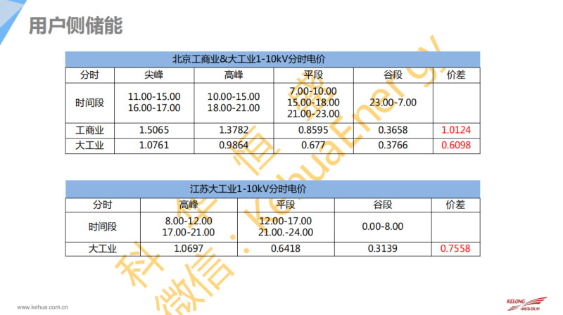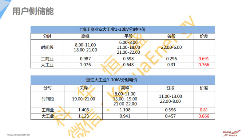 這是我們對于用戶側(cè)儲能的分析。在用戶側(cè),電網(wǎng)有電的時候PCS做一些削峰填谷的應(yīng)用。我們的儲能系統(tǒng)給廠區(qū)里面的主要負荷來供電,主要大頭是削峰填谷的收益,如果變壓器的需量情況比較特殊也可以通過控制這個。還有負荷平滑還有應(yīng)急供電這樣一些隱形收益。目前相對來說峰谷差價比較好可能集中在北京、江蘇和上海。這邊是對現(xiàn)在北京、江蘇、上海峰谷差價做的調(diào)整。江蘇的工業(yè)差價會好一點,大概有0.75元。上海和浙江的大工業(yè)的電價差,上海的大工業(yè)電價差也不錯,有0.76。這是我們針對杭州地區(qū)做的一個初步峰谷預(yù)算。這邊有一個隱形的因素,能不能做一些需量的調(diào)節(jié)。這邊對需量沒有做詳細的計算,主要是峰谷差價的計算。在峰谷差價,因為杭州當(dāng)?shù)氐募夥鍟r刻是兩小時。假設(shè)配500kW和1.25MWh的系統(tǒng),這樣算下來其實投資和收益的成本并不能做到一個很好的很可觀的投資收益。在這樣的系統(tǒng)中主要影響因素可能是設(shè)備的一些充放電效率還有設(shè)備成本。