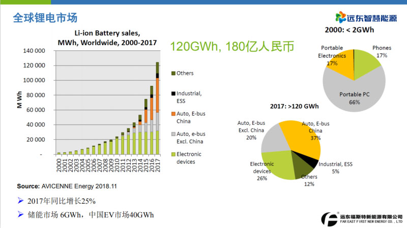 簡單介紹一下整個鋰電池市場的發(fā)展概況。這是全球鋰電池的一個最新數(shù)據(jù)。2017年全球的鋰電池是120GWh。2017年針對動力電池,中國和海外的加起來一共是57%,其他的是數(shù)碼類的,動力電池占到了絕對多數(shù)。這是動力電池的市場預(yù)測。咱們中國數(shù)據(jù)來源,2017年中國電動汽車達(dá)到了120萬量。絕對數(shù)是最多的,但是其實挪威占比最高,全國電動化率超過6%。我們預(yù)測2030年,中國動力電池電動汽車乘用車、客車、卡車分別達(dá)到26%,歐洲達(dá)到23%。2030年,中國2-3輪車電動化將達(dá)到90%。我想在2020年最后或者2030年全面電動化以后成本就不是特別大的問題。這是我們儲能的預(yù)測,給了兩個圖。一個是海外的預(yù)測,2025年認(rèn)為儲能會做到17GWh。這是一個戶用儲能,現(xiàn)在做得比較多也比較熱。尤其是歐洲或者澳洲。包括日本,基本上一年也在10萬臺到20萬臺。產(chǎn)值應(yīng)該在二三十億。