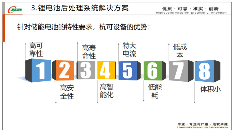 我們目前的鋰電池都是一些大電池的產(chǎn)品、大電流的產(chǎn)品、高功率的產(chǎn)品,所以對(duì)于它的能量消耗客戶是非常關(guān)注的,所以我們?cè)诔潆姾头烹娦誓壳皝碇v,充電效率能達(dá)到85%,放電效率回收的效率能控制在82%。為了更大的能夠讓客戶獲得產(chǎn)能的提升,我們?cè)隗w積小型化方面做了很多的努力,能夠讓目前我們?cè)O(shè)備使用的體積降低75%,就是說空間利用率能夠更得到一個(gè)提高。