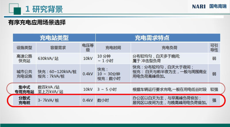 南瑞公司在有序充電方面做了大量的前期調(diào)研工作,這個(gè)是有序充電場(chǎng)景研究的一個(gè)調(diào)研情況表,按照充電設(shè)備類型來(lái)進(jìn)行分類的。按照目前的充電設(shè)備可以劃分為:高速路快速充電站、城市快速充電站、城市專用充電站和分散式充電樁。高速公路還有城市的快充站,主要目的是快速補(bǔ)充電能,時(shí)間越短越好,對(duì)于有序充電的引導(dǎo)性比較弱,沒(méi)有時(shí)間進(jìn)行引導(dǎo)。對(duì)于集中式的專用充電站,例如公交充電站,公交公司對(duì)充電價(jià)格還是比較敏感的,他們一般的充電規(guī)律是在夜間進(jìn)行主要充電,白天利用??空具M(jìn)行快速的電能補(bǔ)充,所以它的引導(dǎo)性相較前兩者要強(qiáng)。最后,分散充電樁主要指的是在小區(qū)或者是單位/公司停車場(chǎng)部署的交流充電樁,一般車輛停車時(shí)間比較長(zhǎng),對(duì)用車迫切度也不是很高,有序可引導(dǎo)性也是最強(qiáng)的,這也是我們研究的主要場(chǎng)景。