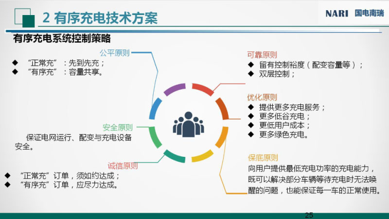 正常充電跟有序充電的區(qū)別,正常充電用戶對(duì)充電價(jià)格并不敏感,對(duì)時(shí)間要求是比較高的;有序充電是用戶有充裕的充電時(shí)間,對(duì)充電價(jià)格有一定的要求,對(duì)100%充滿并不是特別關(guān)注。這張圖是策略執(zhí)行的執(zhí)行架構(gòu),平臺(tái)控制策略負(fù)責(zé)負(fù)荷曲線的預(yù)測(cè),宏觀的調(diào)控;能源控制器負(fù)責(zé)本地的控制策略,實(shí)現(xiàn)臺(tái)區(qū)下的負(fù)荷微觀調(diào)控、精準(zhǔn)調(diào)控和實(shí)時(shí)調(diào)控。能源路由器和充電樁是作為執(zhí)行端來(lái)執(zhí)行上端下發(fā)的控制策略。安全方面和經(jīng)濟(jì)方面是控制策略主要因素,安全方面有臺(tái)區(qū)的越限、三相不平衡等因素;經(jīng)濟(jì)方面有峰谷電價(jià)、新能源消納等因素。