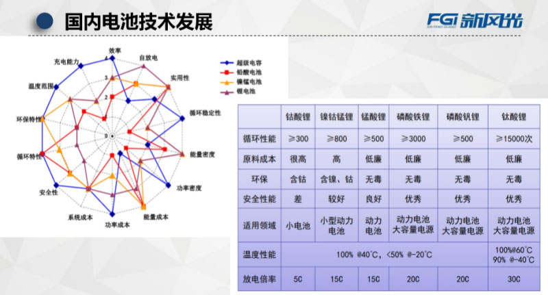 我這幅圖針對超級電容還有鋰電池它的14個指標(biāo)做了一個分析,我們可以看到的就是超級電容藍色的那個在八九個點上面得分比較高的,鋰電池雖然在自放電、還有實用性和能量密度上面都有比較好的評分,但是有幾個安全性的問題,它的得分并不高。根據(jù)我們電站的作用不同選擇不同的儲能介質(zhì),在整個儲能建設(shè)過程當(dāng)中需要考慮的問題,是電能容量的要求,還是快速響應(yīng)儲能容量的要求,選擇的介質(zhì)是完全不一樣的。在這里說了一個電解電容它的充電能力還有充放電率做了一個比較,還有就是鋰電池在這里面從它的循環(huán)性,適用領(lǐng)域做了一個對比。所以現(xiàn)在來看的話,大家選擇比較多的就是碳酸鋰電池,還有硫酸鋰電池,在做儲能的時候,它在選擇的時候,成本有的時候會考慮的比較多。