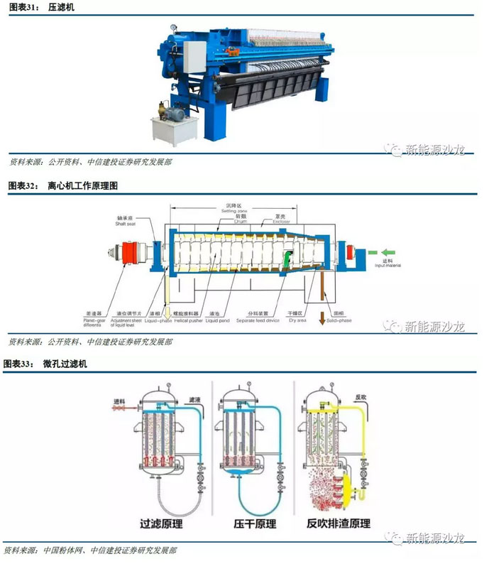 過(guò)濾和洗滌設(shè)備:過(guò)濾和洗滌作用是將反應(yīng)得到前驅(qū)體漿料實(shí)現(xiàn)固液分離,然后采用洗滌液對(duì)得到前驅(qū)體濾餅進(jìn)行洗滌,去除殘留在濾餅中的硫酸根、氯根、鈉離子等。目前主流廠家均采用過(guò)濾洗滌一體化設(shè)備,包括壓濾機(jī)、離心機(jī)、微孔過(guò)濾機(jī)、過(guò)濾洗滌“二合一”設(shè)備等。