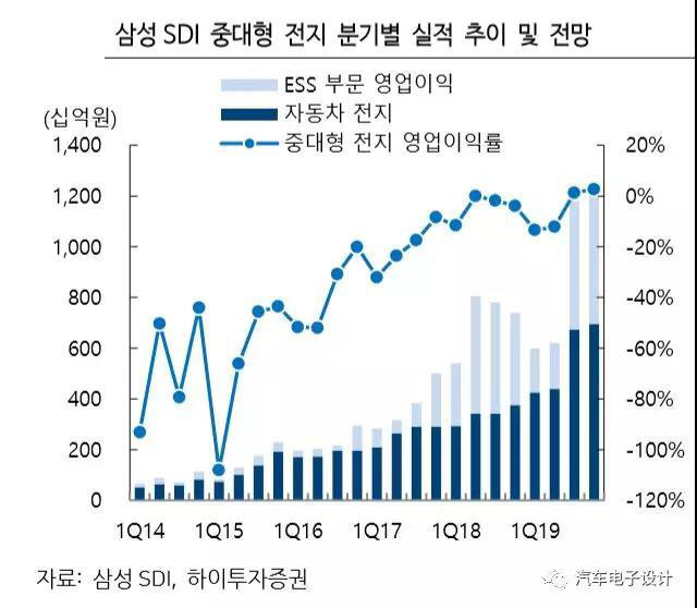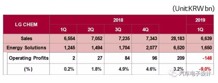 LG化學和三星SDI兩家公司分別在第一季度做了處理,大電池方面的業(yè)務的盈利情況采取了處置:LG采取了1200億韓元的處理,包括一次性的800億韓元ESS火災的處置費用,所以如下圖所示,這個季度的運營情況收到了影響。