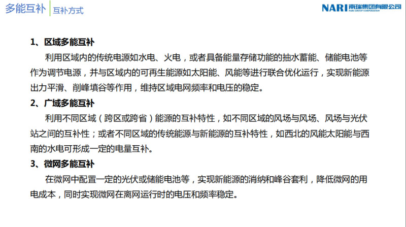 同時(shí)我們現(xiàn)在國家的三棄問題比較突出,通過配置這些具有電能存儲(chǔ)能力的調(diào)節(jié)電源也可以有效解決這個(gè)問題。第二個(gè)就是介紹一些多能互補(bǔ)的方式,我個(gè)人認(rèn)為現(xiàn)在主要有三種互補(bǔ)方式,就是主要利用區(qū)域內(nèi)傳統(tǒng)的水電能源,或者儲(chǔ)能電池跟可再生能源做一些運(yùn)行來平滑新能源的出力,主要就是應(yīng)用一些跨區(qū)或者跨省的能源之間的互補(bǔ)的特性。比如不同區(qū)域的風(fēng)電跟光伏有一個(gè)互補(bǔ)的特性,不同區(qū)域的比如說我們這個(gè)風(fēng)能還有太陽能比較分子的西北地區(qū)還有我們這個(gè)水電能源比較突出的西南地區(qū)的能源之間也可以形成一定的電量互補(bǔ)。
