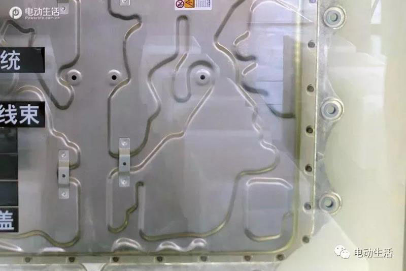 由于這個(gè)電池包帶有液冷系統(tǒng),因此冷卻液通過下箱體與電芯之間,帶有液體流通管道的冷卻液導(dǎo)板。由于樣品被遮擋,我們用I-PACE的電池箱體做示意,原理基本一樣。
