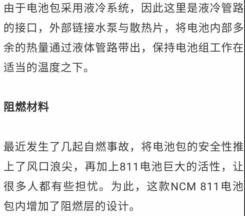 電池包在位于電芯的上部增加了這個(gè)阻燃層,如果萬一電芯發(fā)生燃燒,那么阻燃層會拖延電芯部分的火勢,向電池上部外殼及車身燃燒的進(jìn)度,增加乘員離開車輛的時(shí)間。這一個(gè)阻燃層重量約2.5公斤。