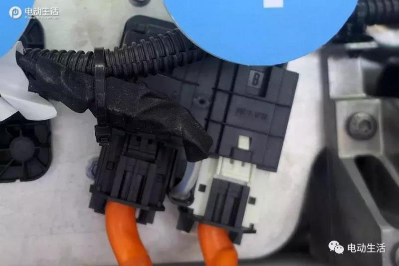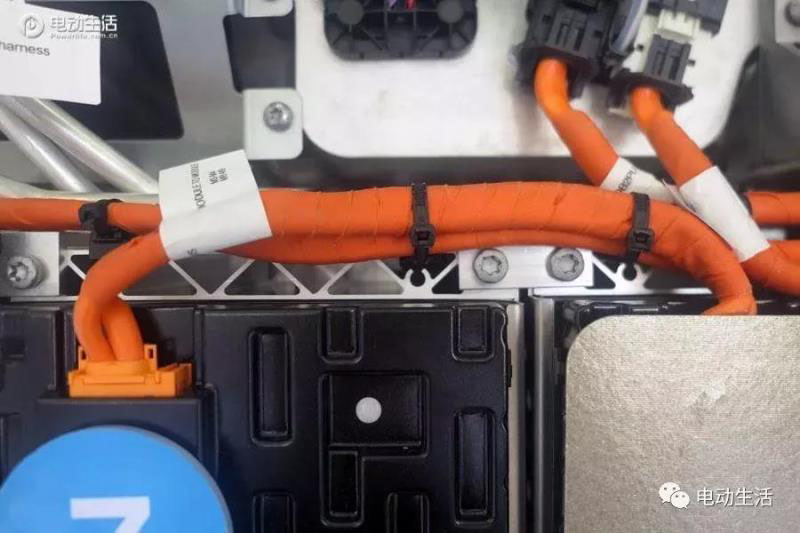 在電池包內(nèi)的高壓線需要經(jīng)受高溫高壓的考驗(yàn),因此凡是涉及動(dòng)力電池高壓線部分,全都會采用這種橘色絕緣布纏繞包裹的高壓線材。這沒什么可多說的,這條就過了。